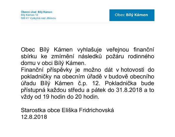 Vyhlášení veřejné sbírky na pomoc v obci Bílý Kámen